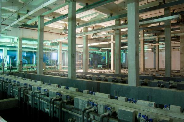 廣州市京溪地下凈水廠工程。該工程日處理污水10萬噸,安裝工程約4200萬元。設計采用先進的“膜生物反應器MBR污水處理工藝”,污水廠出水水質達到一級A,相當于地表Ⅳ類水以上,稍作過濾即可飲用。整套處理工藝設備采用“地下全埋式”,征地面積大為縮小,僅相當于傳統(tǒng)工藝正常占地面積的1/10。整個廠設在地下,分2層,最深-20米,目前是采用此種工藝全球最大的地下污水處理廠。