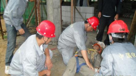 8:30 應(yīng)急救援小組趕到事故現(xiàn)場,現(xiàn)場管理人員說明事故情況及已采取措施。救護人員汪岳榮首先通報自己是紅十字救護員,求助現(xiàn)場人員,模擬人員王成彬(助手),120救護車引導(dǎo)員(陳學(xué)飛)前往大門口接應(yīng)120救護車。隨后,呼叫、安撫、檢查傷員情況,發(fā)現(xiàn)傷員左大腿骨折,右手臂受傷,其他地方無大礙。救護人員對傷者采取臨時救護,用夾板及繃帶對傷腿進行綁扎固定,并抬上擔(dān)架等待救護車。