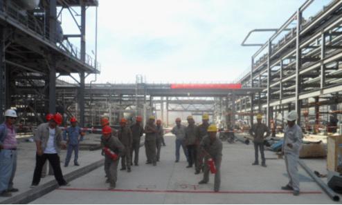 活動中,項目部通過張貼消防畫冊、懸掛橫幅、制作安全宣傳欄和組織員工觀看警示教育片等,開展了形式多樣的安全文化活動。為避免高溫中暑現象,采取了宣傳防暑降溫知識、對食堂伙食進行調節(jié)、避開高溫時段作業(yè)、定期為一線員工送涼茶和綠豆湯等切實有效的防護措施。在此基礎上,6月18日在生活區(qū)開展了緊急撤離聯合演練,6月21日組織了施工隊消防接力賽和開展火災撲救演練,提高員工風險防范意識和自救互救等災害應對能力。同時,對施工現場開展專項檢查,對發(fā)現的安全隱患責令立即整改。
