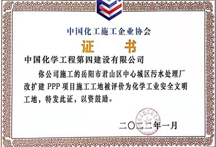 近日,從中國(guó)化工施工企業(yè)協(xié)會(huì)傳來喜訊,由市政工程公司承建的岳陽(yáng)市君山區(qū)中心城區(qū)污水處理廠改擴(kuò)建PPP項(xiàng)目被評(píng)為“化學(xué)工業(yè)安全文明工地”稱號(hào)。