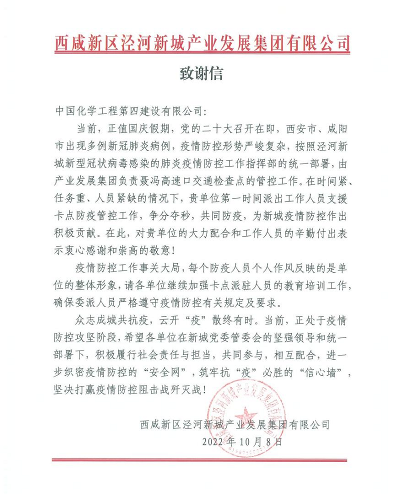 公司收到西咸新區(qū)涇河新城產(chǎn)業(yè)發(fā)展集團發(fā)來致謝信