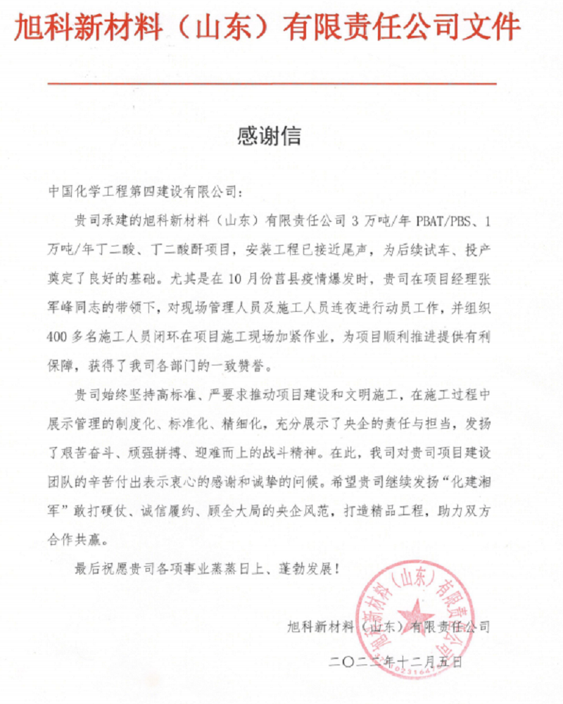 華北公司旭科新材料項目收到業(yè)主感謝信