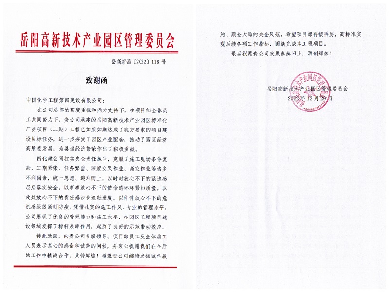 近日,市政工程公司收到岳陽高新技術產(chǎn)業(yè)園區(qū)管理委員會發(fā)來的《致謝函》,高度贊揚市政公司在承建的岳陽高新技術產(chǎn)業(yè)園區(qū)標準化廠房項目(二期)工程建設過程中展現(xiàn)出來的精誠合作、頑強拼搏的施工風范,并感謝市政公司對于園區(qū)產(chǎn)業(yè)配套升級和經(jīng)濟高質量發(fā)展所做出的努力和貢獻。