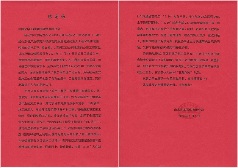 新年伊始,江西公司收到山東裕龍石化有限公司的《感謝信》,感謝江西公司在承建的山東裕龍石化公用工程區(qū)給排水及消防管網(wǎng)項目中,保質保量完成了業(yè)主的年度節(jié)點目標,為后續(xù)裝置安裝施工的全面展開創(chuàng)造了有利的條件,工程建設的加速度、高標準贏得了各方的高度認可,公司無私奉獻、頑強拼搏的施工風范和一心為業(yè)主服務的理念,體現(xiàn)了央企的責任和擔當。
