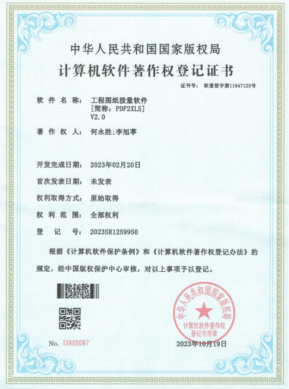 近日,公司取得由國家版權(quán)局頒發(fā)的《工程圖紙撥量軟件》著作權(quán)登記證書。這是公司繼《企業(yè)短信群發(fā)系統(tǒng)》《企業(yè)外經(jīng)證業(yè)務(wù)管理系統(tǒng)》后獲得的第3項(xiàng)計(jì)算機(jī)軟件著作權(quán)登記證書。