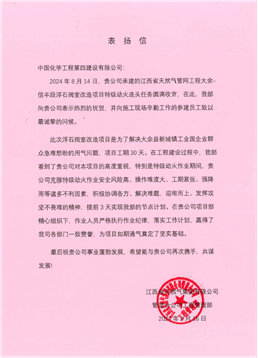 信中表示,在工程建設(shè)過程中,公司對項(xiàng)目建設(shè)高度重視,特別是特級動火作業(yè)期間,公司克服特級動火作業(yè)安全風(fēng)險高、操作難度大、工期緊張、強(qiáng)降雨等諸多不利因素,積極協(xié)調(diào)各方、迎難而上,提前3天實(shí)現(xiàn)節(jié)點(diǎn)計(jì)劃。在項(xiàng)目部精心組織下,作業(yè)人員嚴(yán)格執(zhí)行作業(yè)紀(jì)律,落實(shí)工作計(jì)劃,為項(xiàng)目如期通氣奠定了堅(jiān)實(shí)基礎(chǔ),贏得了江西省天然氣集團(tuán)各部門一致贊譽(yù)。