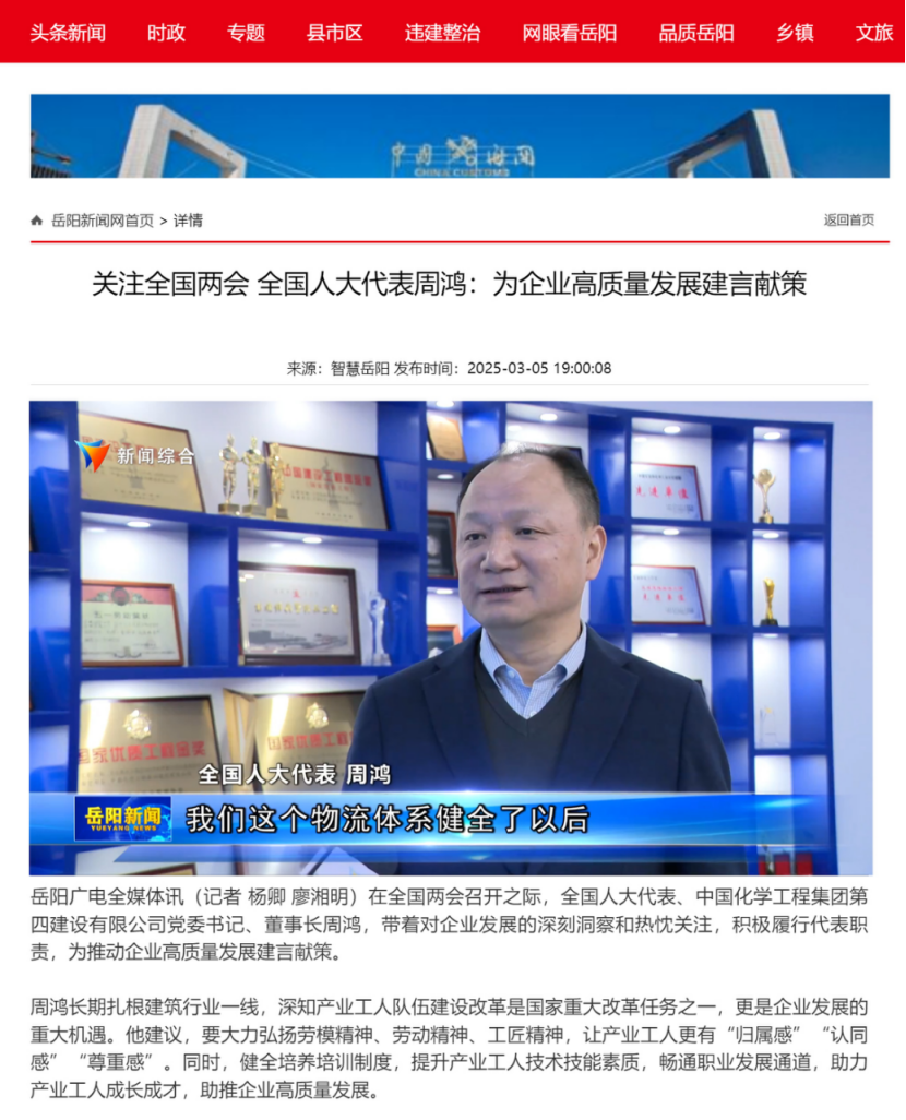 2025年全國(guó)兩會(huì)期間,全國(guó)人大代表,中國(guó)化學(xué)四化建黨委書記、董事長(zhǎng)周鴻向大會(huì)提交《關(guān)于加強(qiáng)產(chǎn)業(yè)工人隊(duì)伍建設(shè)的建議》《關(guān)于多措并舉解決拖欠建筑施工企業(yè)工程款的建議》《關(guān)于推動(dòng)洞庭湖區(qū)常岳九鐵路、荊岳鐵路、監(jiān)利至華容至益陽鐵路規(guī)劃建設(shè)提速的建議》《關(guān)于修改最高法院〈關(guān)于大型企業(yè)與中小企業(yè)約定以第三方支付款項(xiàng)為付款前提條款效力問題的批復(fù)〉的建議》等4條建議,受到主流媒體深入報(bào)道,引起社會(huì)各界廣泛關(guān)注。