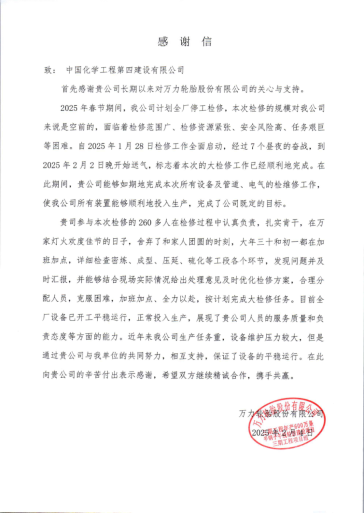 近日,華南公司從化萬(wàn)力輪胎三期項(xiàng)目團(tuán)隊(duì)收到萬(wàn)力輪胎股份有限公司發(fā)來(lái)的感謝信。信中高度贊揚(yáng)公司項(xiàng)目團(tuán)隊(duì)在2025年春節(jié)期間高效完成全廠停工大檢修任務(wù),以專(zhuān)業(yè)能力和責(zé)任擔(dān)當(dāng)助力業(yè)主實(shí)現(xiàn)“開(kāi)門(mén)穩(wěn)、開(kāi)門(mén)紅”。