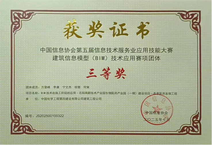 近日,在中國(guó)信息協(xié)會(huì)第五屆信息技術(shù)服務(wù)業(yè)應(yīng)用技能大賽上,由建筑工程公司BIM技術(shù)小組成員萬(wàn)登峰、李康、桂慧、寧文杰、何寅共同創(chuàng)作的參賽作品——《BIM技術(shù)在施工階段的應(yīng)用:岳陽(yáng)高新技術(shù)產(chǎn)業(yè)園生物醫(yī)藥產(chǎn)業(yè)園(一期)建設(shè)項(xiàng)目·晶易醫(yī)藥首期工程》,榮獲建筑信息模型(BIM)技術(shù)應(yīng)用賽項(xiàng)團(tuán)體三等獎(jiǎng)。
