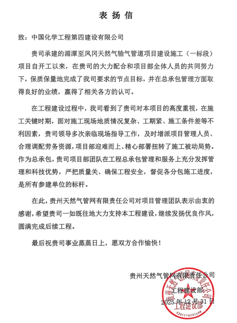 西部公司湄潭至鳳岡天然氣管道項(xiàng)目獲業(yè)主來信表揚(yáng)