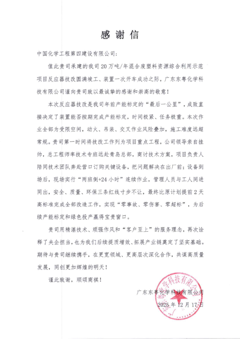 近日,華南公司收到廣東東粵化學(xué)科技有限公司發(fā)來的感謝信,對(duì)華南公司在20萬噸/年混合廢塑料資源綜合利用示范項(xiàng)目反應(yīng)器技改工程中的出色表現(xiàn)給予高度評(píng)價(jià),并對(duì)項(xiàng)目團(tuán)隊(duì)展現(xiàn)出的專業(yè)水準(zhǔn)、過硬作風(fēng)與“客戶至上”的服務(wù)理念表示誠摯感謝。