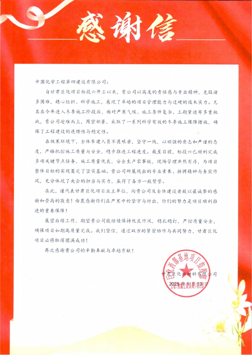 近日,公司收到甘肅巨化新材料有限公司發來的感謝信,對華東公司在甘肅巨化項目標段六建設中的出色表現,特別是在極端嚴寒與暴雪天氣下展現出的專業能力、拼搏精神與責任擔當,給予高度贊揚和衷心感謝。