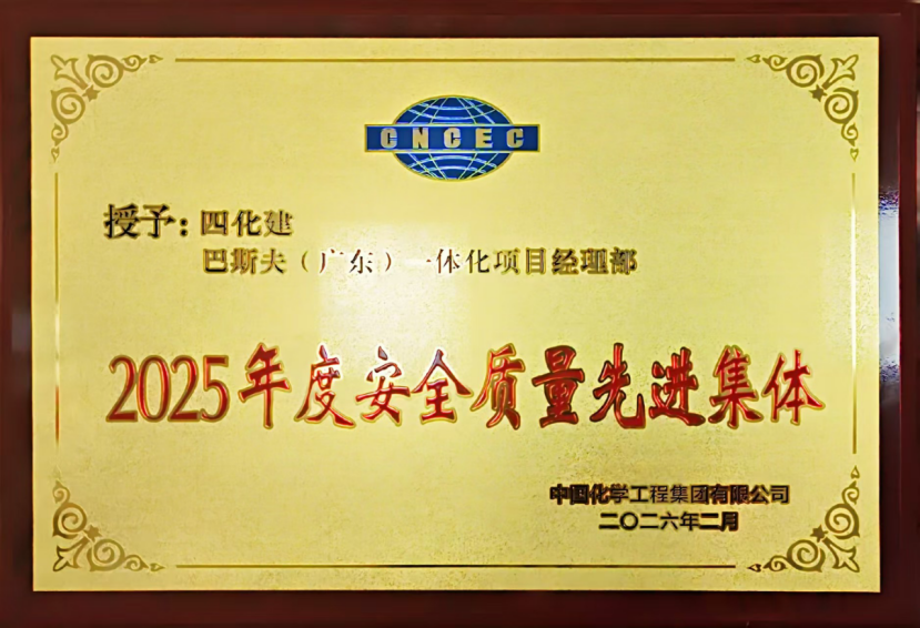 近日,中國化學工程在京召開2026年生產運營安全質量環保工作會議。中國化學工程第四建設有限公司巴斯夫(廣東)一體化項目經理部榮獲“安全質量先進集體”稱號,徐翠文獲評“質量管理先進個人”,陳德貴榮獲“生態環保先進個人”。