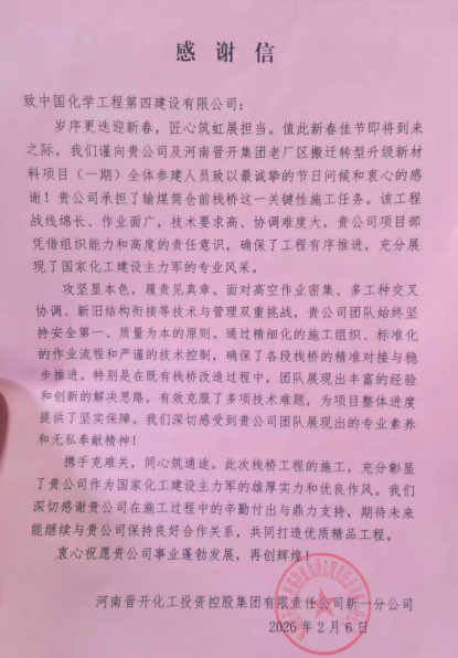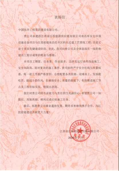 近日,華北公司捷報頻傳,相繼收到江西省江投能源供應鏈有限公司、河南晉開化工投資控股集團有限責任公司新一分公司發來的表揚信與感謝信。業主單位對華北公司承建的江投能源供應鏈及經開區碼頭遷建工藝管線工程、河南晉開項目給予高度評價,并向一線參建員工致以誠摯慰問。