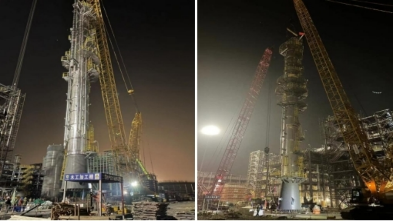 大連恒力石化項(xiàng)目完成苯酚丙酮裝置兩臺(tái)塔器吊裝