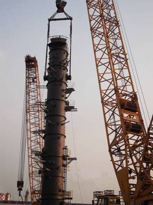 7月22日,江蘇分公司張家港項(xiàng)目部華昌化工原料結(jié)構(gòu)調(diào)整技術(shù)改造二期(凈化)項(xiàng)目現(xiàn)場(chǎng),經(jīng)過(guò)1天緊張有序的檢查確認(rèn),在確保設(shè)備符合吊裝條件后,吊裝總指揮一聲令下,華昌化工二期凈化洗滌塔Ⅰ(第一段256噸)在650噸履帶吊主吊和280噸履帶吊輔吊的吊裝下順利吊裝就位,拉開(kāi)了該裝置大型設(shè)備吊裝的序幕。
