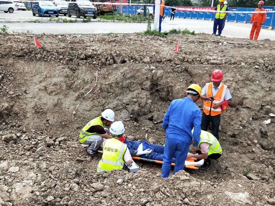 演練開始,現(xiàn)場人員向總指揮報告事故發(fā)生及人員被埋情況,并迅速安排各個救援小組分別進行救援。根據(jù)應急預案,各應急救援組成員收到救援命令后,立即投入到搶險救援工作中去。安保組安排人員封鎖道路,設專人指揮交通,保障現(xiàn)場救援通道暢通;技術保障組及時勘察事故實際情況,避免發(fā)生二次坍塌事故;物資保障組及時提供搶險救援物資;醫(yī)療組緊跟搶險組趕赴現(xiàn)場,迅速展開救援活動,將“獲救”人員用擔架抬至空曠地帶,進行初步包扎和搶救直至救護車到達。