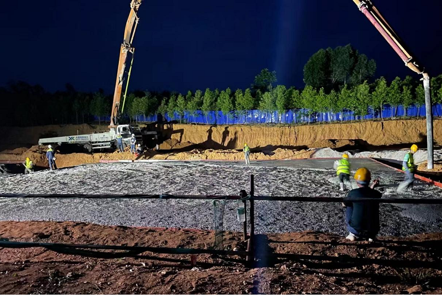 該項(xiàng)目位于崇左市中泰產(chǎn)業(yè)園東北部,過(guò)往車輛繁多,土地中遍布頑石,施工空間壓力與工期壓力并存。在工期的緊迫形勢(shì)下,項(xiàng)目部調(diào)整施工計(jì)劃,增加現(xiàn)場(chǎng)施工人員和設(shè)備物資投入,并合理組織施工資源。白天,70余名工人揮汗如雨;夜間,混凝土澆筑連續(xù)不斷,在嚴(yán)格遵守項(xiàng)目部保安全、抓質(zhì)量的施工標(biāo)準(zhǔn)下,全體員工不辭辛苦、主動(dòng)作為,快速而穩(wěn)健的推進(jìn)項(xiàng)目工程建設(shè)。