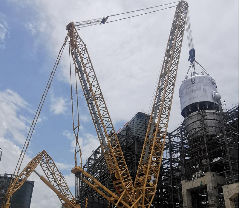 為順利完成該燒炭器的吊裝組對和確保工期,項目部組織人員加班加點,僅一周就做好吊裝前各項施工準備,為順利吊裝奠定了堅實基礎(chǔ)。此次吊裝采用1250噸履帶吊主吊,經(jīng)過24小時奮戰(zhàn),成功完成燒炭器的吊裝組對。