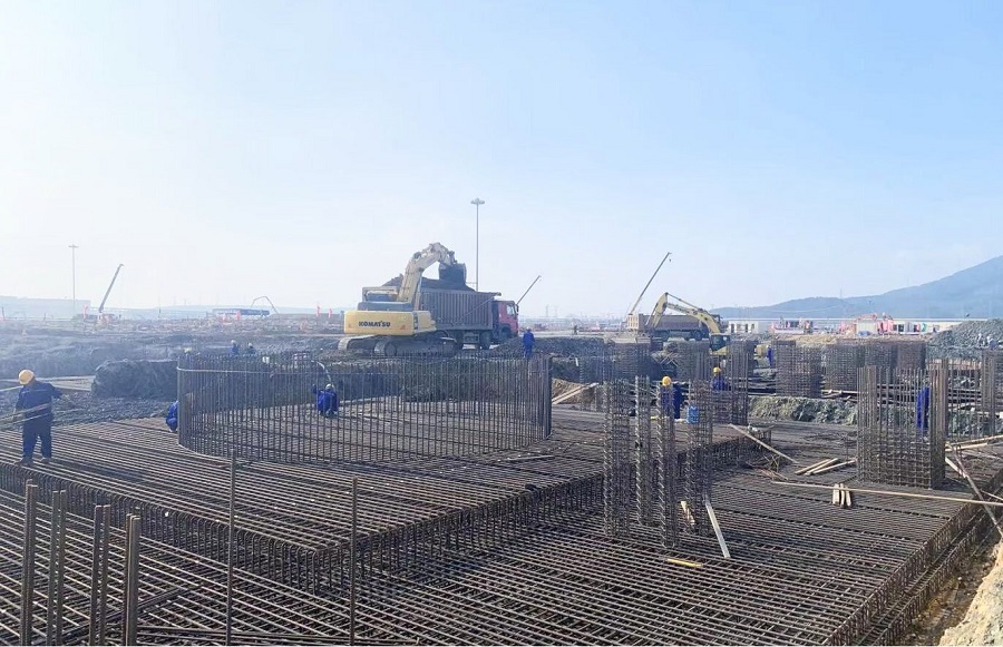 該裝置項目共有7個單元,自8月15日開工以來,項目部克服工期時間緊、地質(zhì)巖石多、施工現(xiàn)場點(diǎn)多面廣、疫情防控難等諸多困難,全力搶抓進(jìn)度。截至目前,初期雨水池池壁鋼筋已綁扎完成,氧化提濃單元核心設(shè)備基礎(chǔ)承臺澆筑完成,精餾單元各框架基礎(chǔ)陸續(xù)施工,異丙苯單元大面積開挖,裝置變電所基礎(chǔ)柱、梁混凝土澆筑完成。項目部將充分利用好當(dāng)前晴好天氣,合理組織班組施工作業(yè),全力加快施工進(jìn)度,確保完成各項既定任務(wù),為黨的二十大勝利召開獻(xiàn)禮。
