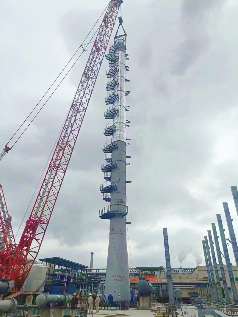 該脫輕塔上塔直徑3米、65米、重量158噸,是1-丁烯裝置的核心設(shè)備,也是工程中最高最重的立式設(shè)備。為確保此次吊裝順利完成,項(xiàng)目部克服工期緊張、工序復(fù)雜等諸多不利因素影響,精心編制了吊裝專項(xiàng)施工方案,對(duì)吊裝人員進(jìn)行安全、技術(shù)、質(zhì)量等方面的交底工作,確保項(xiàng)目“開(kāi)年第一吊”的順利完成(通訊員  孫善義)