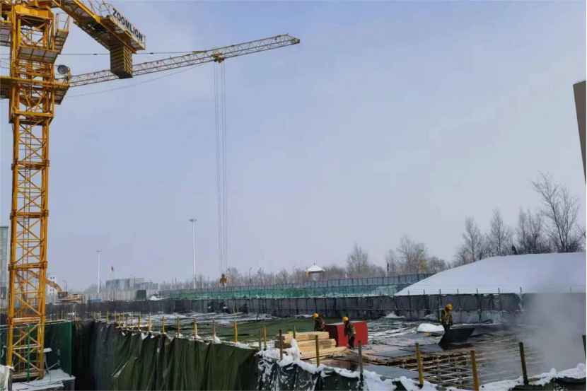 該項目所處新疆烏魯木齊,冬季施工時溫度已達(dá)零下,且隨時面臨氣溫驟降的可能,工期十分緊張。為安全、高效、高質(zhì)量完成目標(biāo),項目部提前策劃,精心部署,發(fā)揮黨員示范帶頭作用,經(jīng)過60余小時的攻堅奮戰(zhàn),分兩次完成了此次筏板澆筑工作。同時,為防止冬季施工凍融現(xiàn)象對周邊既有結(jié)構(gòu)及基坑內(nèi)部造成不良影響,項目部在筏板四周及中間部位搭設(shè)暖棚及蒸汽暖氣包,澆筑時嚴(yán)格控制砼入模及成型溫度,及時覆蓋薄膜,并在砼初凝后覆蓋棉被確?;炷临|(zhì)量。