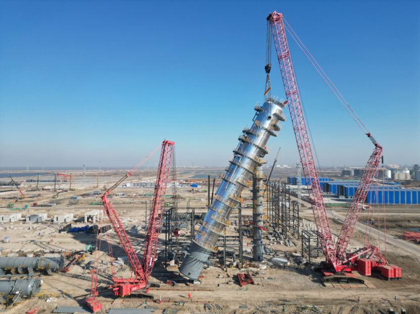 該項目位于河北滄州渤海新區(qū)港城區(qū)石化產(chǎn)業(yè)區(qū),自開工建設(shè)以來,項目部錨定“高標準、高質(zhì)量、高效率”履約目標推進工程建設(shè)。此次吊裝的分餾塔是項目核心關(guān)鍵設(shè)備,高61.6米、直徑6.4米,重274噸,具有吊裝難度大、技術(shù)要求高、安全風險高的特點。