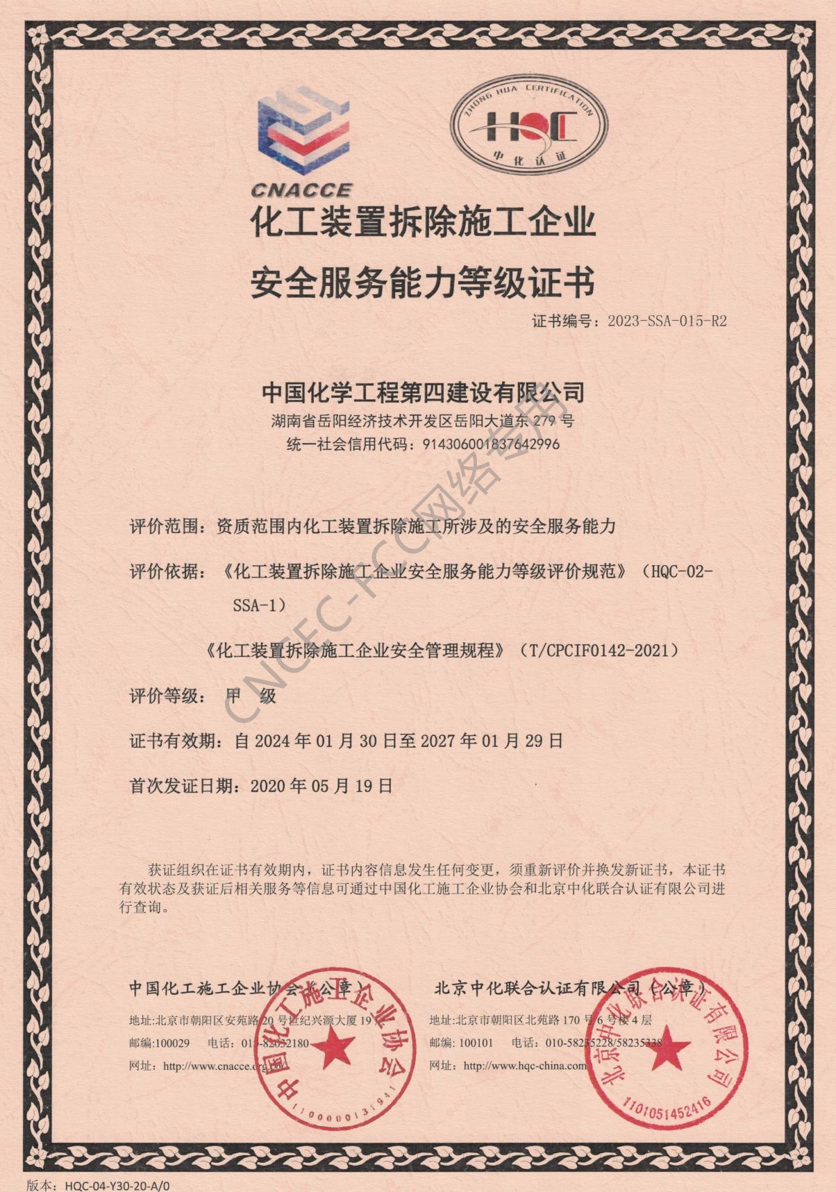 化工裝置拆除施工企業(yè)安全服務(wù)能力等級證書